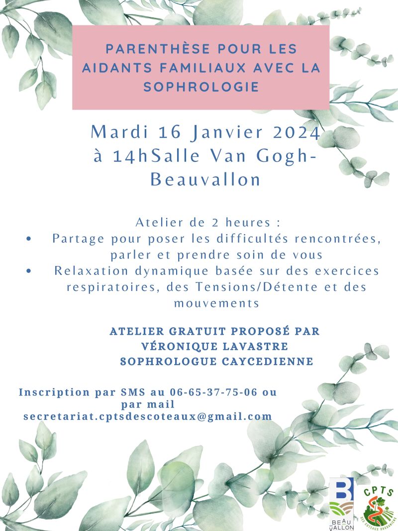 En partenariat avec la commune de Beauvallon, nous proposons un atelier à l'intention des Aidants Familiaux :